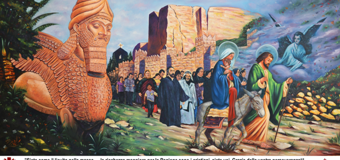 After the Mass, I presented His Holiness with a painting made in cooperation with Caritas Jordan. It was painted by a displaced Iraqi man, where the artwork expressed the painful exodus from the city of Mosul. It is a painting that reflected the human tragedy experienced by thousands of innocent people who were forced to abandon their homes and lands to escape the brutality of ISIS. That painter later left for Australia with his mother, carrying with him memories of pain but also the hope of beginning a new life somewhere else.