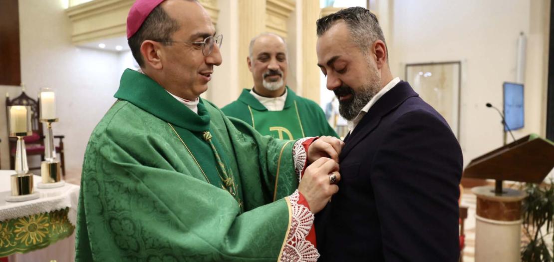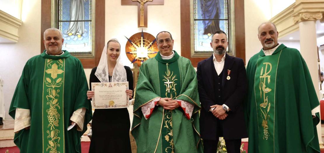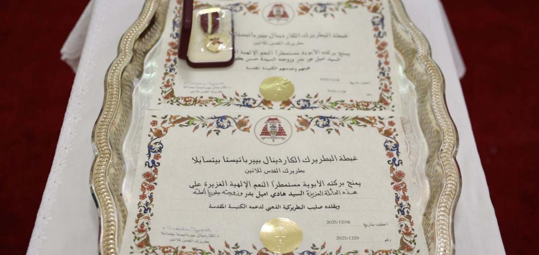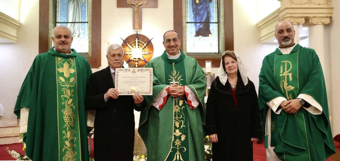 Before the end of the Holy Mass, Bishop Twal presented Mr. Hadi Bader and his wife with the Golden Patriarchal Cross, on behalf of Patriarch Pierbattista Pizzaballa, in recognition of their generous contribution to the construction of the Grotto of Blessed Mary Undoer of Knots. He also presented a certificate of blessing to Mr. Emile Bader and his wife, in appreciation of their support in building the shrine.