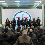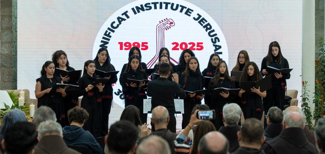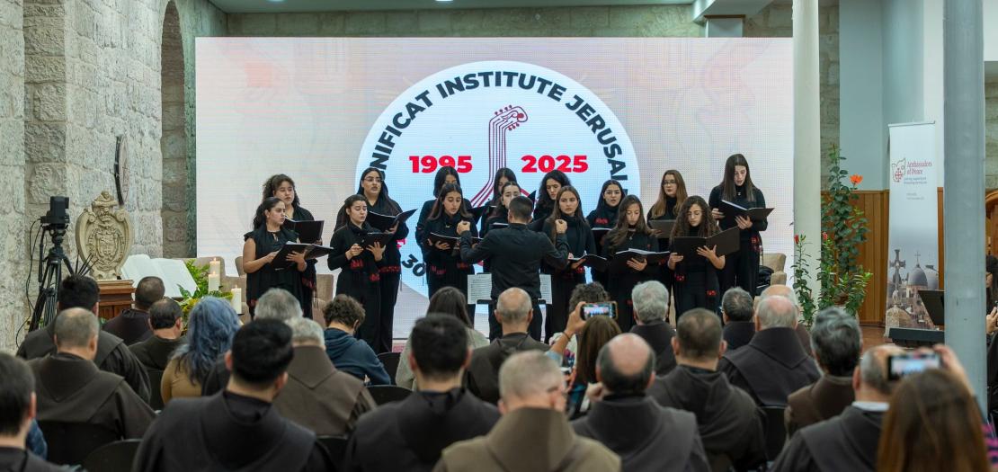 At the conclusion of the day, marked by attentive listening and direct encounter with the "living stones" of the Holy Land, a simple but deeply significant moment took place: a musical tribute from the Magnificat Institute. The Yasmeen Choir, ahead of its tour in Italy from December 4 to 9, wanted to offer the commissaries two pieces from its repertoire as a gesture of gratitude and at the same time as a concrete testimony of the educational and cultural activities carried out by the Magnificat.