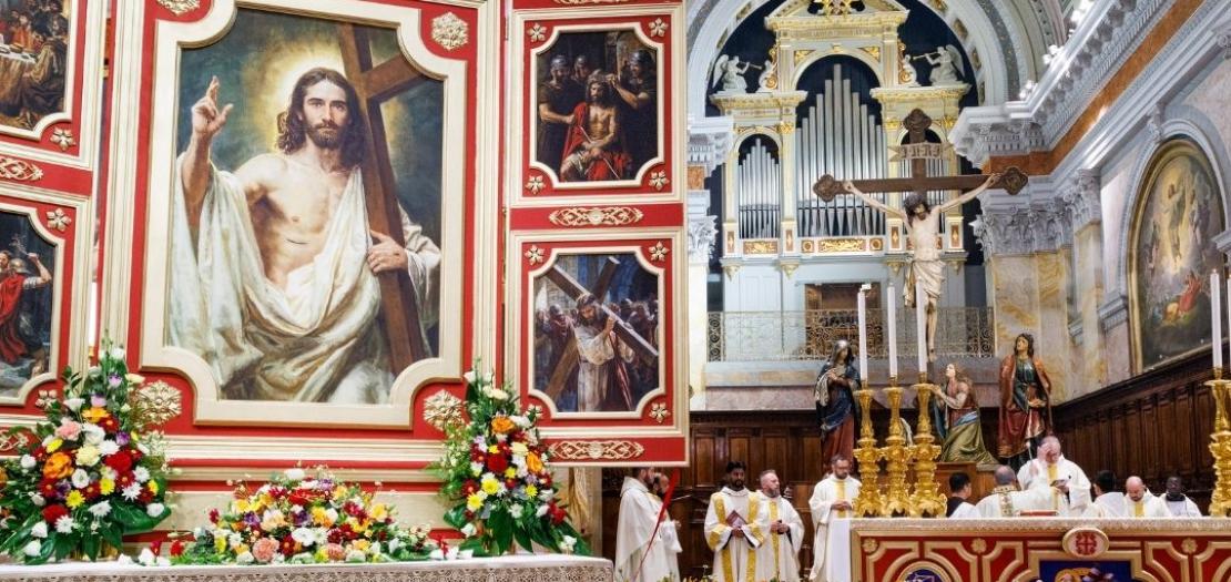 At the beginning of the Eucharistic celebration, the Custos paused before the artistic decoration prepared next to the presbytery and, with a symbolic gesture full of emotion, the two deacons simulated the opening of the tomb, opening the panels of the triptych and revealing the image of the risen and victorious Christ.