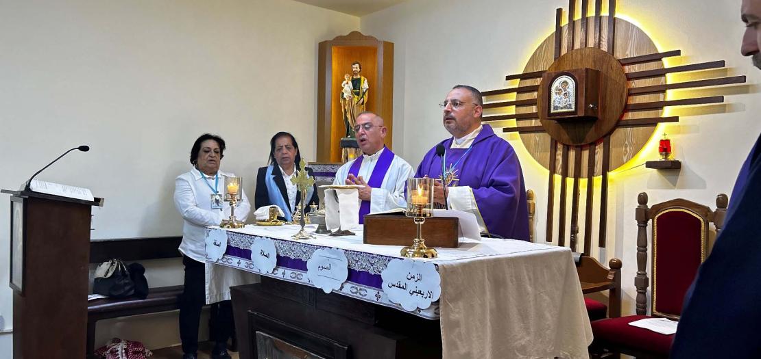 Then, Fr. Ibrahim Naffa’ celebrated Holy Mass which was concelebrated by regional priests. Furthermore, in compliance with a call made earlier by Pope Francis, the Holy Mass was dedicated to peace in the world especially for peace in the Holy Land and Gaza Strip. The meeting concluded with exchanges of good wishes marking the Feast of St. Joseph, Mother's Day, and the Feast of the Annunciation. Presents was also forwarded to attending ladies by the Bible Society of Jordan.