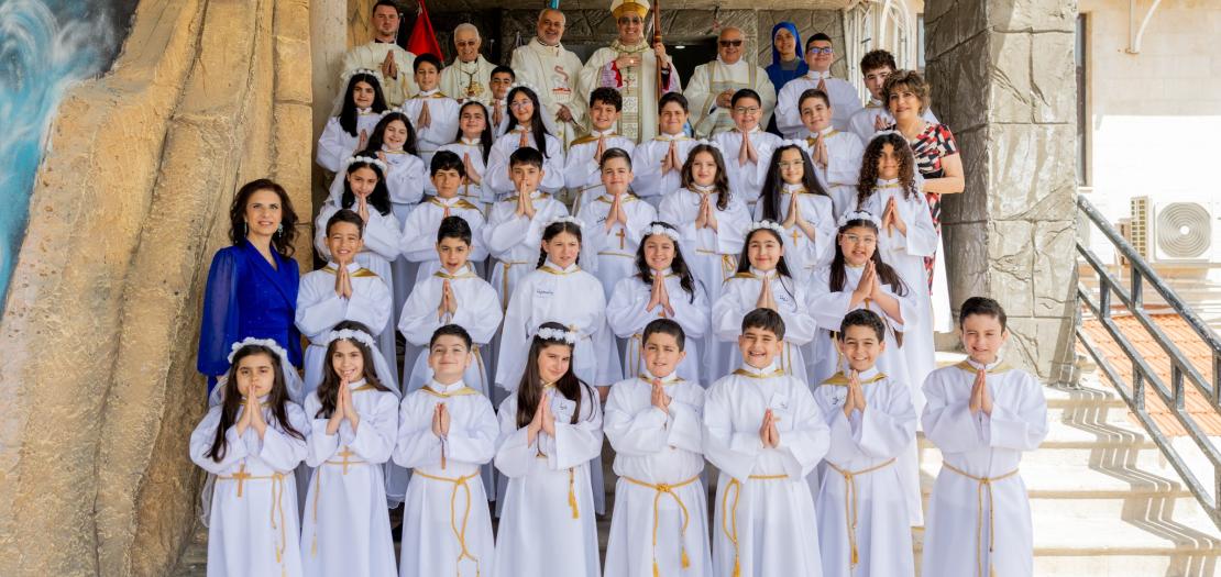 On Friday April 17, a total of 70 boys and girls from the parish of the Sacred Heart of Jesus in Tla' Al-Ali, northwestern Amman, received the Sacraments of their first Holy Communion and Confirmation during a Holy Mass celebrated by Latin Patriarchal Vicar for Jordan Bishop Iyad Twal, in an atmosphere that exuded faith par excellence.