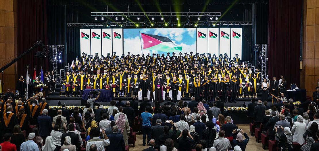 During the graduation ceremony, a supplication was said for the victims of the collapsed residential building in Jabal Luwaibdeh, Amman, referring to those who lost their lives, the injured and the suffering. Appreciation was also extended to the tireless efforts exerted by paramedics. The text of the supplication was composed by Chairman of the AUM Board of Trustees and Latin Patriarchal Vicar Bishop William Shomali at the outset of the he celebration.