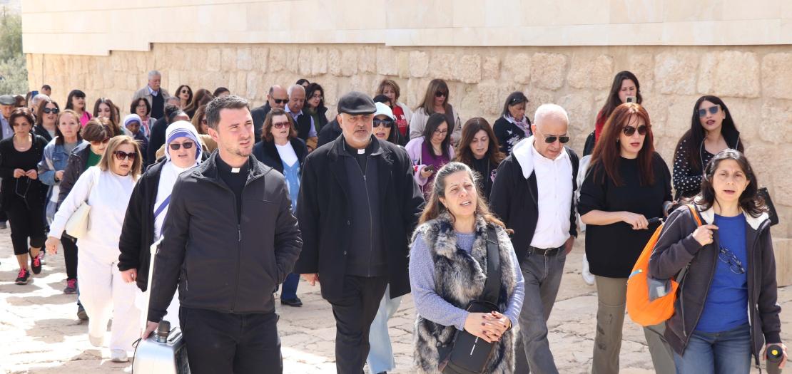 During the lecture, Fr. Bader recalled Saint John Paul II's visit to Mount Nebo in 2000, and called for unity with him in prayer for peace. He also made a reference to Pope Francis' encyclical "Dilexit Nos" (He Loved Us) on devotion to the loving Heart of Jesus. Later, the faithful proceeded to the church while reciting the Holy Rosary and then continued to the Mosaic Church, where Fr. Ya’coub Dainouti celebrated Holy Mass during which special prayers were offered for the grace of peace in the Holy Land, for the suffering East, and for the perpetuality of stability in the land of the baptism. In his homily, Fr. Ya’coub stressed the importance of love and forgiveness during the Lenten Season, and urged the parishioners to consolidate their relationship with God during this blessed time.