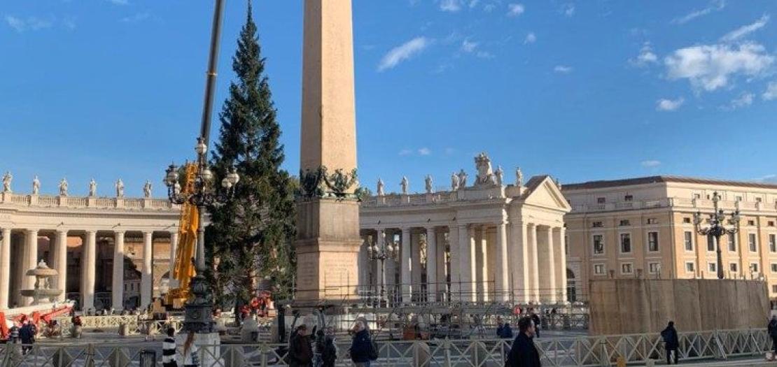 A 25-meter-tall red fir tree is now standing in St. Peter’s Square. This year, the tree comes from the Val d’Ultimo area in the province of Bolzano and was given by the municipalities of Lagundo and Val d’Ultimo, located in the northern part of Italy.